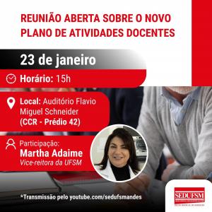 Na próxima segunda, 23 de janeiro, acontece uma reunião aberta para debater a proposta de minuta elaborada pela Reitoria da UFSM que trata do novo plano de atividades docentes, que implica em novo cômputo para os encargos didáticos.