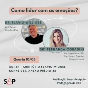 Os palestrantes serão o Dr. Flávio Williges (Departamento de Filosofia da UFSM) e a Dr.ª Fernanda Coradini (Psicóloga Clínica, especialista em Terapia Cognitivo Comportamental).