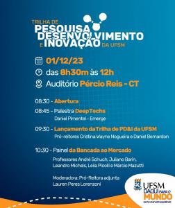 Após a palestra, será lançada a Trilha de Pesquisa, Desenvolvimento e Inovação e, por fim, será realizado um painel onde professores da UFSM vão relatar sobre sua experiência com a Trilha. Os docentes participantes serão: Leandro Michels, do Departamento de Processamento de Energia Elétrica; Juliano Smanioto Barin, do Departamento de Tecnologia e Ciência Alimentos; Marcio Antonio Mazutti, do Departamento de Engenharia Química; Leila Picolli da Silva, do Departamento de Zootecnia e André Passaglia Schuch, do Departamento de Bioquímica e Biologia Molecular.