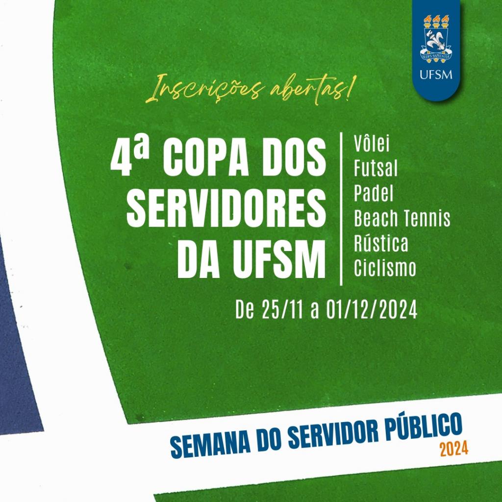 A Pró-Reitoria de Gestão de Pessoas (PROGEP) informa que estão abertas as inscrições para a 4ª Copa dos Servidores da UFSM.