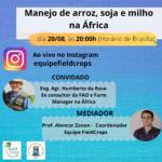 A Equipe FieldCrops da UFSM convida para a live MANEJO DE ARROZ, SOJA E MILHO NA ÁFRICA, com a presença do Eng. Agrônomo Humberto da Rosa (foi consultor da FAO, atualmente farm manager na África) e do mediador Prof. Alencar Zanon (Equipe FieldCrops UFSM).
