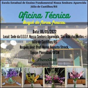 A Escola Estadual de Ensino Fundamental Nossa Senhora Aparecida, a Emater/RS-Ascar, as Equipes PhenoGlad e o Projeto Flores para Todos convidam para Oficina Técnica de Buquê de Flores Frescas da nona fase do Projeto Flores para Todos em Júlio de Castilhos/RS, dia 06 de maio de 2022 (sexta -feira).