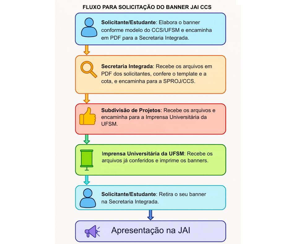 A Direção do Centro de Ciências da Saúde (CCS) torna públicas as normativas e orientações para solicitação de apoio na impressão de banners referentes aos trabalhos aprovados na 40ª Jornada Acadêmica Integrada (JAI) da UFSM.