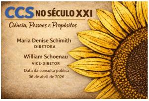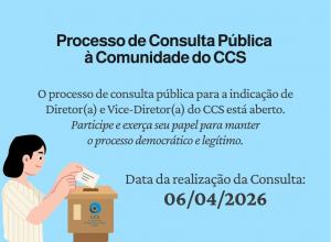 A Comissão de Consulta Pública do Centro de Ciências da Saúde, nomeada pela Portaria CCS/UFSM N. 394 DE 15 DE DEZEMBRO DE 2025, DECLARA aberto o Processo de Consulta à Comunidade do CCS para organização da Lista Tríplice com vistas à nomeação do Diretor(a) e Vice-Diretor(a) do Centro de Ciências da Saúde, para o período 2026/2030, de acordo com o que estabelece o Art. 36, combinado com o Art. 25, do Estatuto da UFSM.