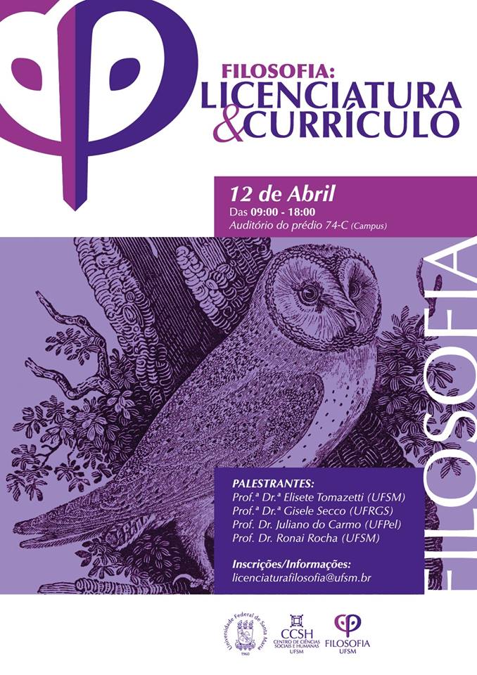 O curso de Licenciatura em Filosofia da UFSM tem experiência em discutir o assunto, por contar com pesquisadores importantes da área. Assim, eles estarão no Colóquio de amanhã: o professor Ronai Rocha e a professora Elizete Tomazetti, da UFSM, se juntam aos professores Juliano do Carmo (UFPel) e Gisele Secco (UFRGS) para as atividades que ocorrerão no Auditório do prédio 74-C, no campus.