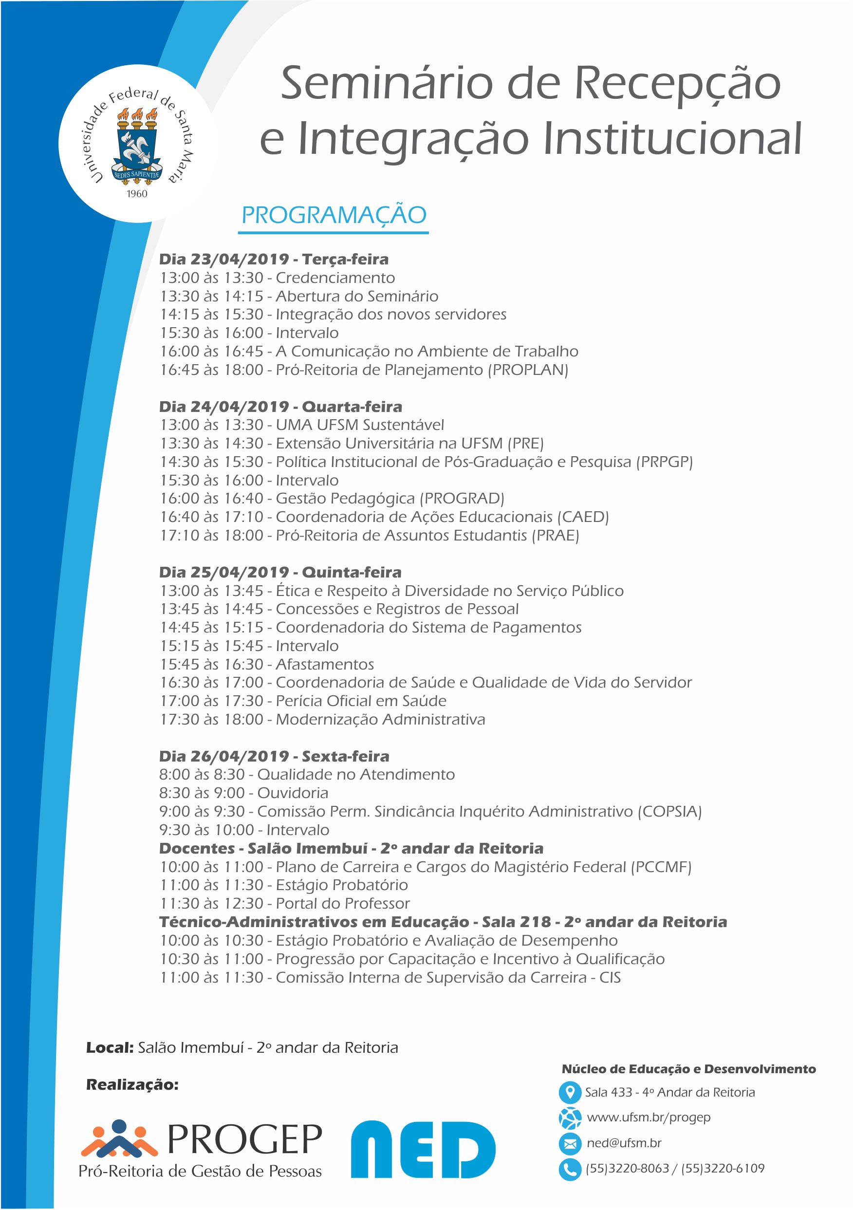 O Núcleo de Educação e Desenvolvimento (NED) da Pró-Reitoria de Gestão de Pessoas (PROGEP) promoverá, no período de 23 a 26 de abril de 2019, o Seminário de Recepção e Integração Institucional. O evento tem como objetivo acolher, ambientar e integrar os servidores técnico-administrativos em educação e docentes ingressantes no quadro de pessoal, auxiliando na minimização de possíveis inseguranças e no desenvolvimento de relações interpessoais positivas, contribuindo para a excelência do seu trabalho na Instituição.