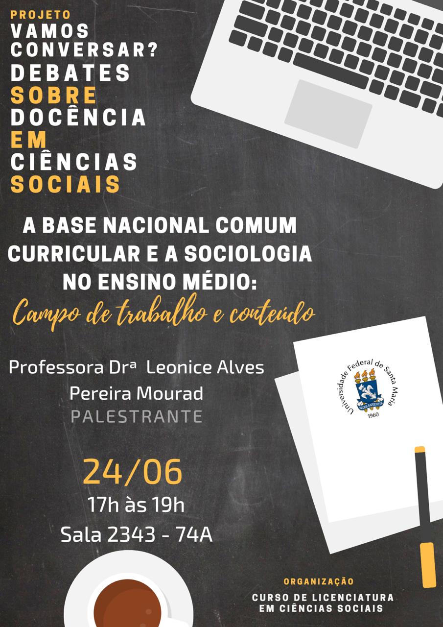 A segunda edição vai analisar os impactos da Base Nacional Comum Curricular (BNCC) na disciplina de Sociologia no Ensino Médio. A palestra, com a professora Leonice Alves Pereira Mourad, do Departamento de Metodologia de Ensino, Centro de Educação, tratará das questões que envolvem a BNCC relacionadas à Sociologia no Ensino Médio, incluindo campo de trabalho e organização de conteúdos nas novas definições, incluindo a Reforma do Ensino Médio, a qual altera a organização disciplinar e os processos formativos.