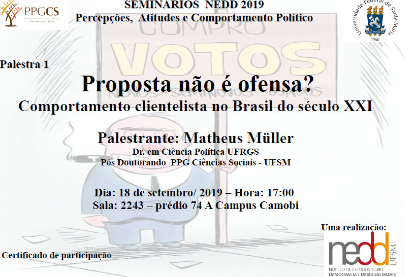 Proposta não é ofensa? Comportamento clientelista no Brasil do século XXI” será palestrado por Matheus Muller, doutor em Ciência Política/UFRGS e Pós-doutorando no PPG Ciências Sociais/UFSM.