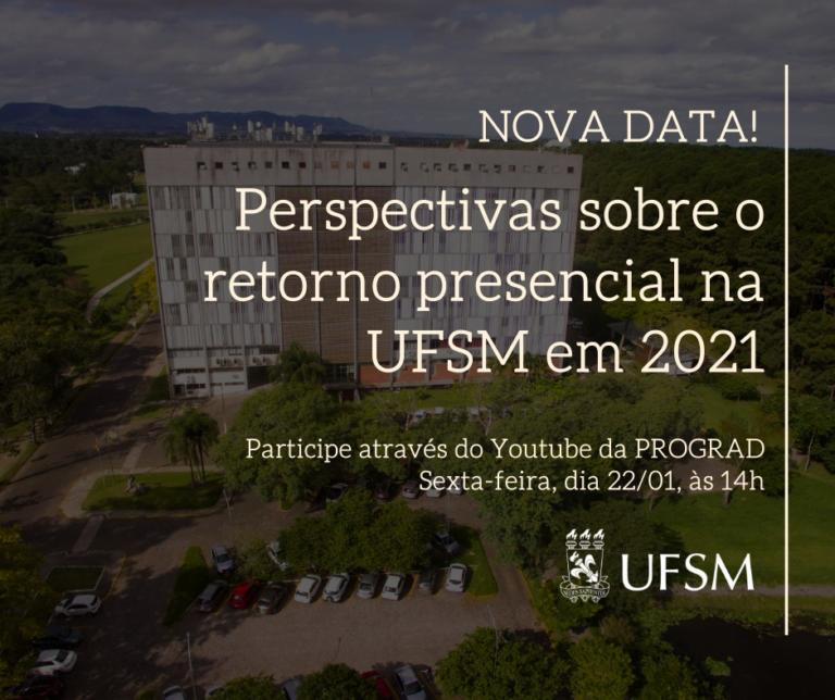 Marcada para acontecer na manhã de hoje (20), a reunião “Perspectivas sobre o retorno presencial na UFSM em 2021”  foi transferida para a próxima sexta, dia 22, às 14 horas. A transmissão será feita através do Canal no YouTube da PROGRAD