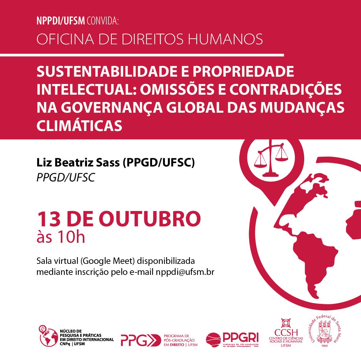 “Sustentabilidade e Propriedade Intelectual: omissões e contradições na governança global das mudanças climáticas” ministrada por Liz Beatriz Sass (PPGD/UFSC) a ser realizada no dia 13 de outubro, 10h, via Google Meet com link disponibilizado mediante inscrição pelo e-mail nppdi@ufsm.br