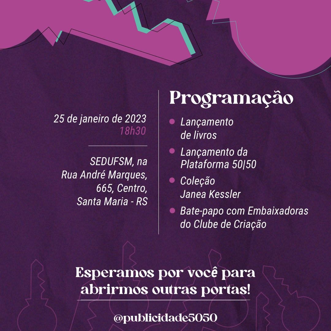 – Lançamento do livro “Abrindo Portas” (publicado pela Editora Facos-UFSM), que resgata a história dos 5 primeiros anos do Projeto 50|50, divulgando sua metodologia, para que estudantes, docentes e profissionais do campo da comunicação possam organizar o projeto nas instituições em que atuam.