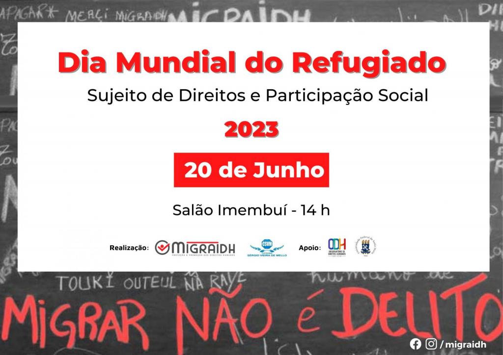 No Dia Mundial do Refugiado, 20 de junho, ocorre o evento temático Sujeito de Direitos e Participação Social, promovido pelo Migraidh e Cátedra Sérgio Vieira de Mello. A atividade inicia às 14h, no Salão Imembuí (Reitoria). O evento é aberto ao público.