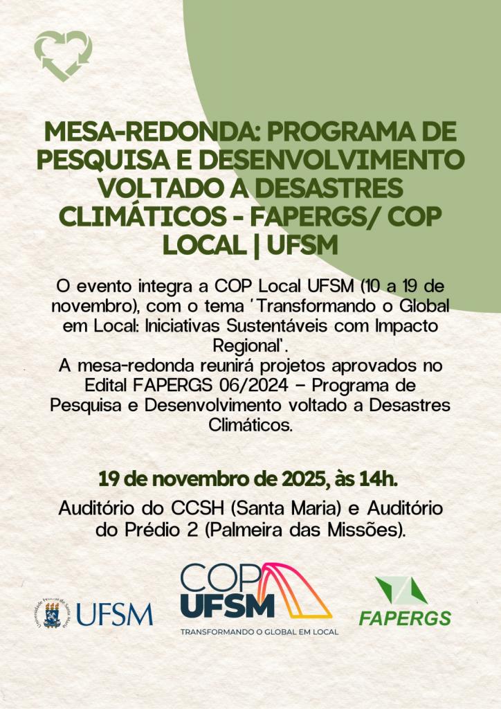 A UFSM realiza no dia 19 de novembro, às 14h, uma mesa-redonda sobre os projetos contemplados no Edital FAPERGS 06/2024, voltado a pesquisas em desastres climáticos. O evento ocorre no Auditório do CCSH (Prédio 74C) e na Sala 231, do Campus de Palmeira das Missões, com inscrições gratuitas e certificação de 4 horas. A atividade integra a programação da COP Local UFSM, iniciativa da Pró-Reitoria de Extensão alinhada à COP 30, que destaca o papel da universidade frente à emergência climática.