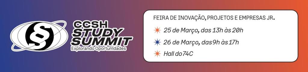Nos dias 25 e 26 de março, o Centro de Ciências Sociais e Humanas realiza mais uma edição do CCSH Study Summit, evento que reúne projetos, grupos de pesquisa, empresas juniores e diversas iniciativas acadêmicas que fazem parte do cotidiano do Centro.