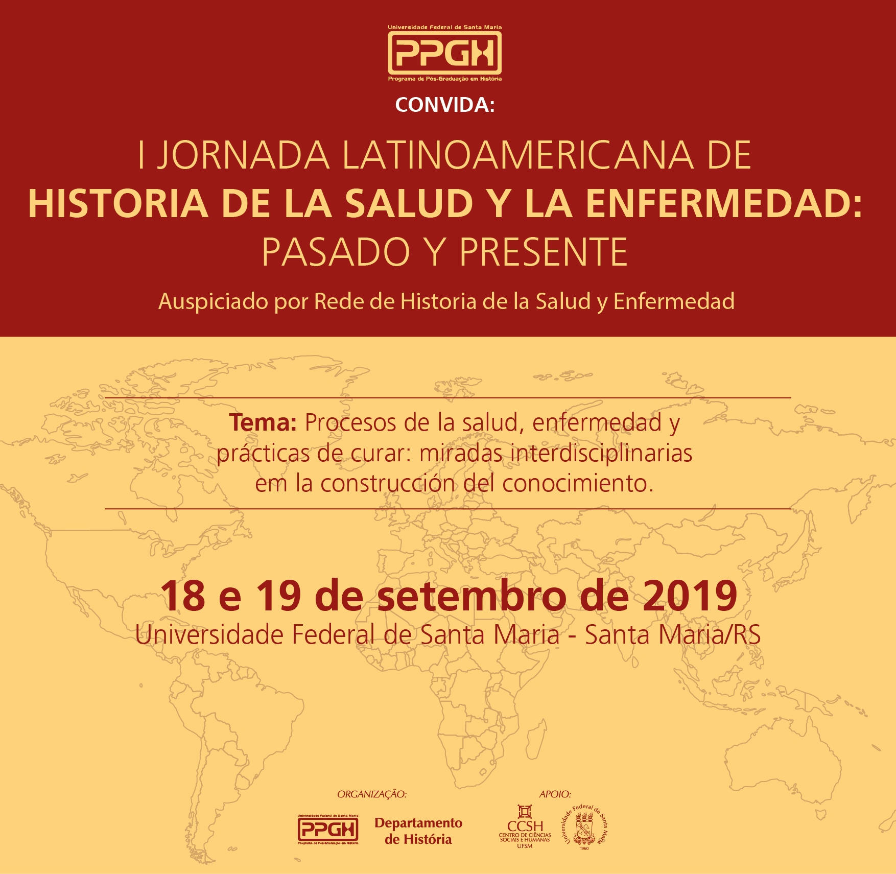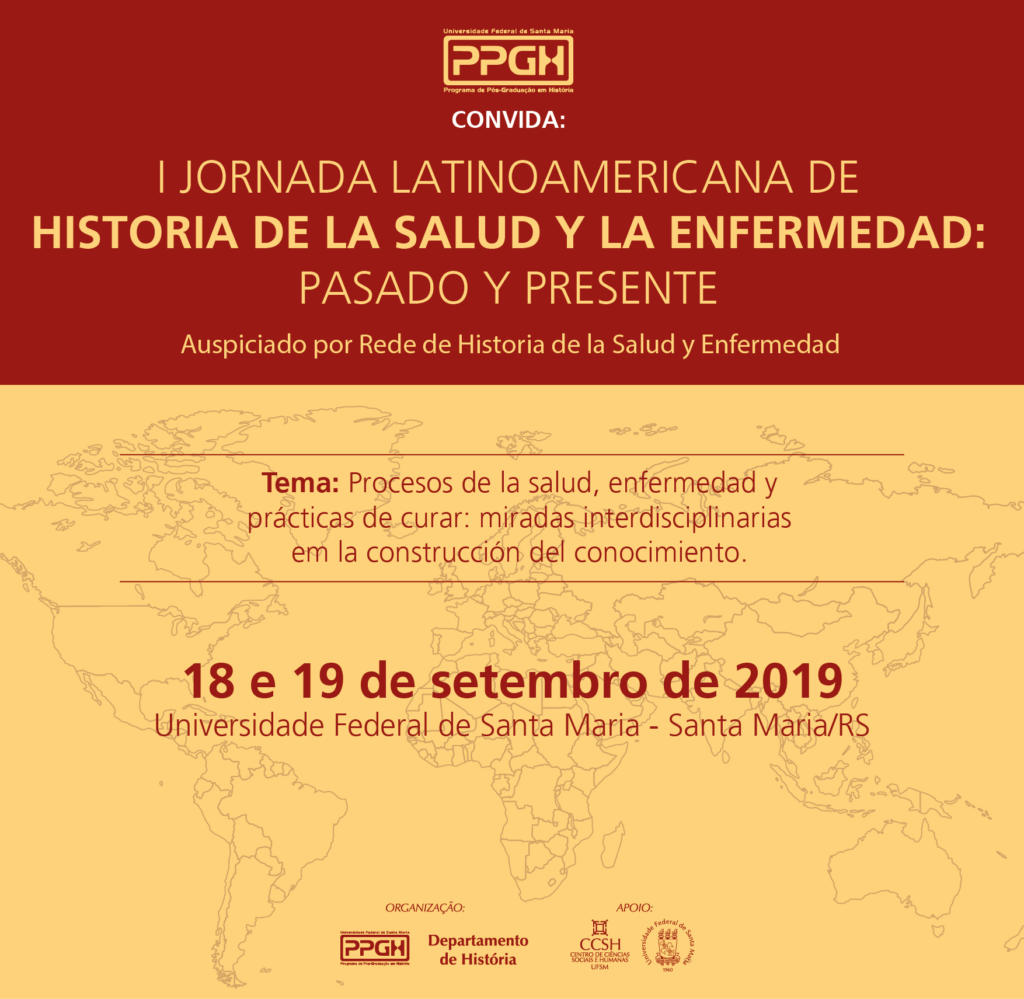 A I Jornada Latinoamericana de Historia da Saúde e da Enfermidade ocorrerá em 18 e 19 de setembro de 2019 na Universidade Federal de Santa Maria, Santa Maria, Rio Grande do Sul. Brasil. O grupo aspira fortalecer o intercâmbio científico ampliando as possibilidade s de vinculação e de trabalho conjunto com investigadores de diversas nacionalidades, como argentinos, brasileiros, chilenos, colombianos, peruanos e quem mais possa se somar. O encontro está aberto a investigadores de história e demais áreas, como sociologia, antropologia, demografia, psicologia e áreas vinculadas à saúde, como medicina e enfermagem. Acolhe trabalhos de graduandos, pós-graduandos e profissionais que atuam e/ou pesquisam em temáticas que possam dialogar com a história, oferecendo uma ampla perspectiva para refletir sobre o campo mais amplos de história da saúde e da enfemidade.