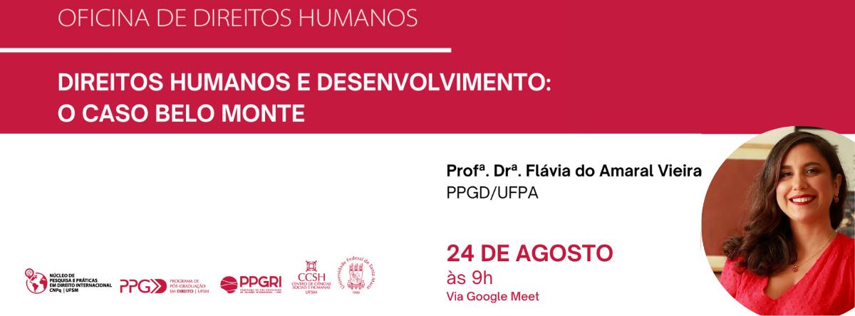 Professora Flávia do Amaral Vieira (PPDG/UFPA)A Oficina de Direitos Humanos do mês de agosto propõe uma análise sobre o entrelaçamento entre as lutas por direitos humanos e os projetos de desenvolvimento na Amazônia, através do caso da Usina Hidrelétrica de Belo Monte. O caso é um marco das tensões entre desenvolvimento e direitos humanos na região, e será explorado nesta Oficina por indicar desafios para a promoção e proteção dos direitos humanos, que refletem a importância do esforço histórico das redes transnacionais de defesa dos direitos humanos pela responsabilização internacional dos Estados. A Oficina será ministrada pela Professora Flávia do Amaral Vieira (PPDG/UFPA).