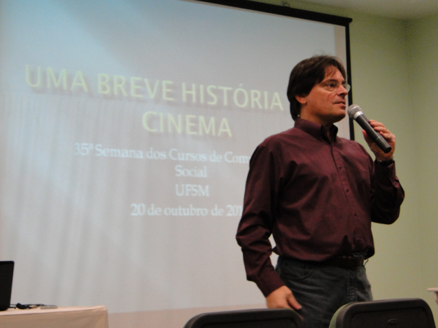 No primeiro dia de oficinas da 35ª SECOM, o professor Rogério Koff, diretor do Centro de Ciências Sociais e Humanas da UFSM, ministrou a oficina de “História do Cinema”. Apaixonado pela sétima arte, o oficineiro falou durante três horas sobre os marcos que revolucionaram o cinema, desde a invenção do cinematógrafo, pelos irmãos Lumière, até os efeitos especiais característicos dos blockbusters do cinema norte-americano moderno.