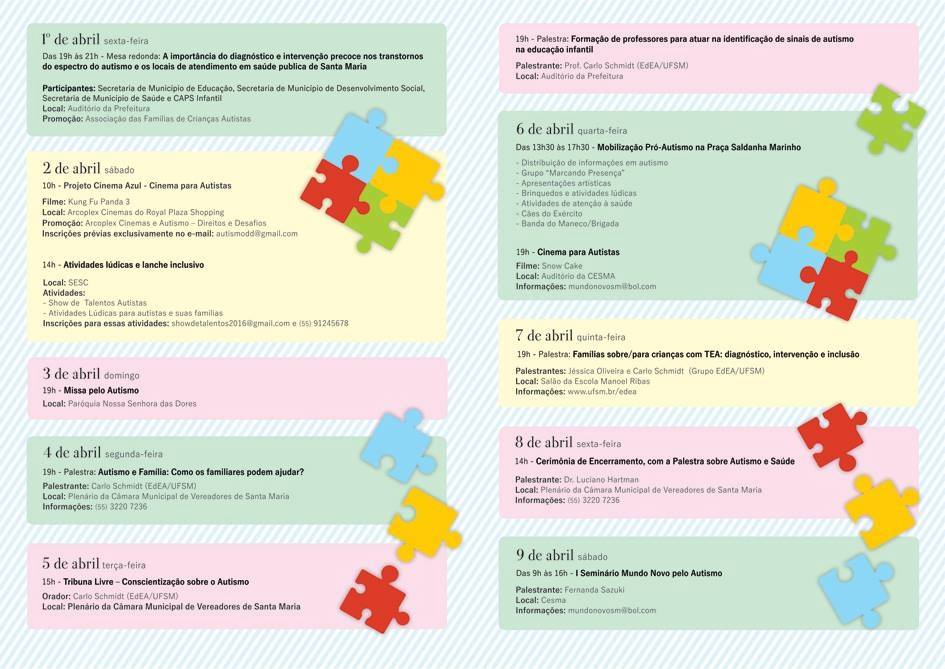 As atividades da 2ª Semana Municipal de Conscientização seguem até o dia 19 de abril. Veja abaixo a programação: