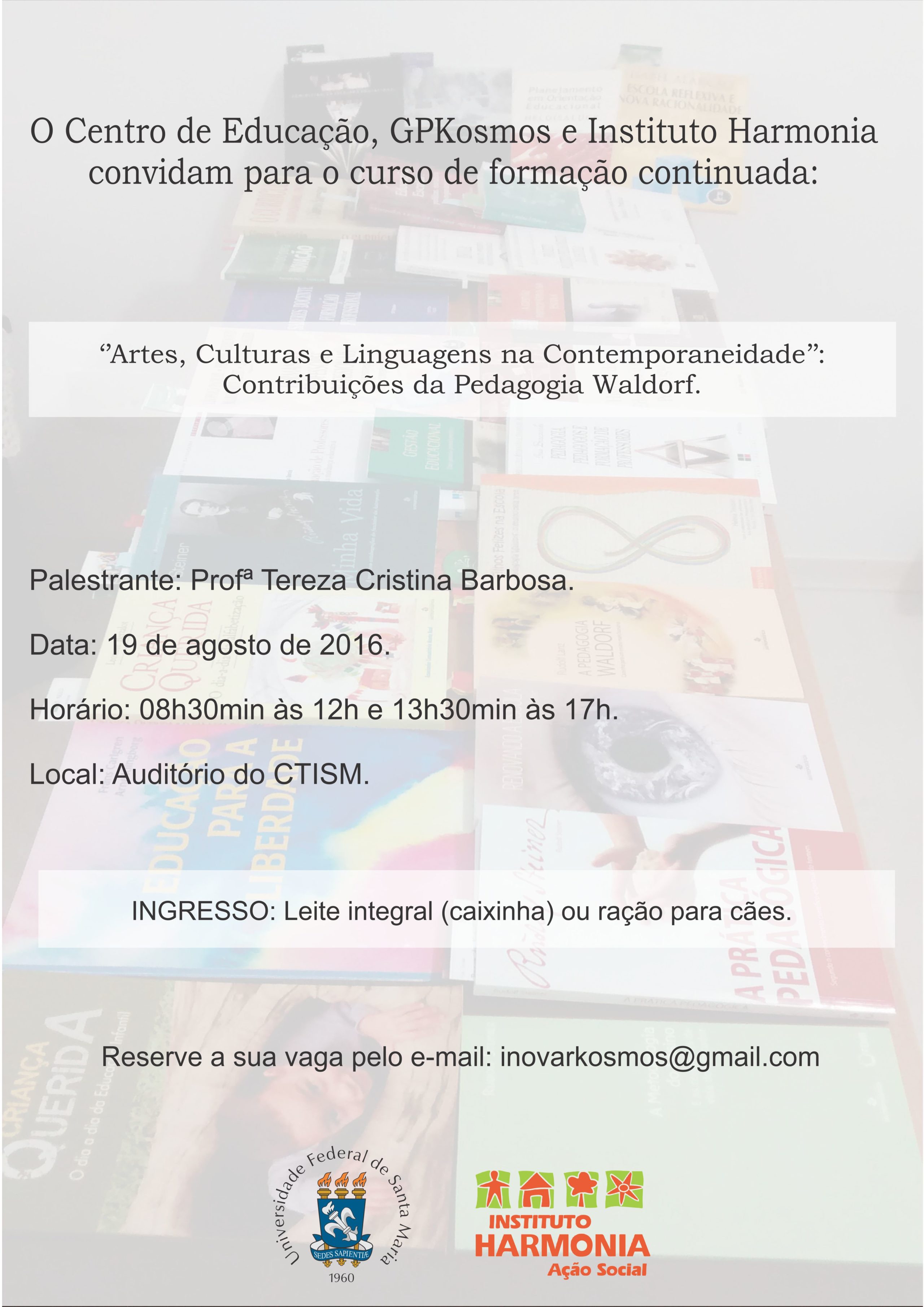 Em agosto, o Grupo de Pesquisa Kosmos (GPKosmos), do Centro de Educação, e o Instituto Harmonia realizam um curso de formação continuada sobre a Pedagogia Waldorf. O curso “Arte, Cultura e Linguagens na Contemporaneidade: Contribuições de Pedagogia Waldorf” ocorre no dia 19 de agosto e será ministrado pela professora Tereza Cristina Barbosa.