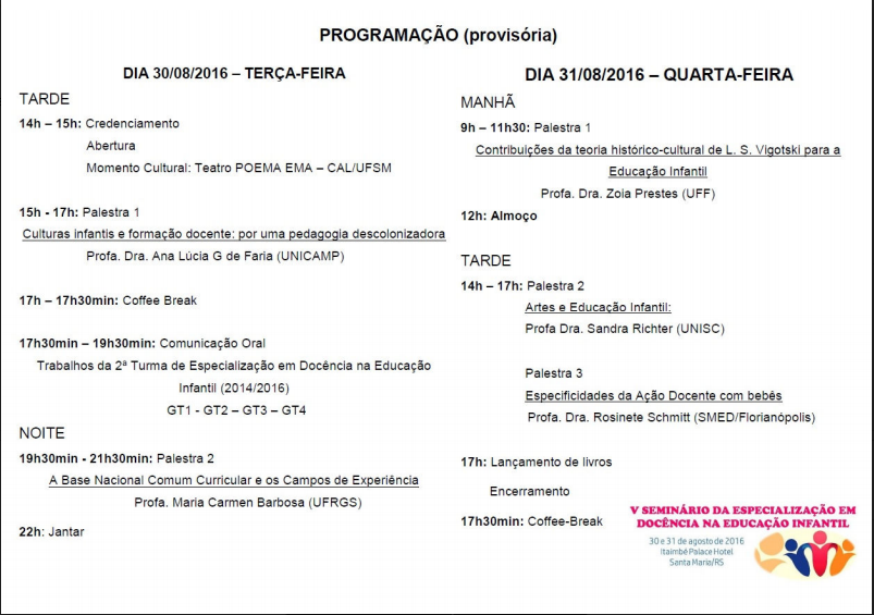 Na próxima semana, a coordenação do Curso de Especialização em Docência na Educação Infantil, do Centro de Educação, realiza o V Seminário da Especialização em Docência na Educação Infantil. O evento acontecerá nos dias 30 e 31 de agosto, no Itaimbé Palace Hotel.