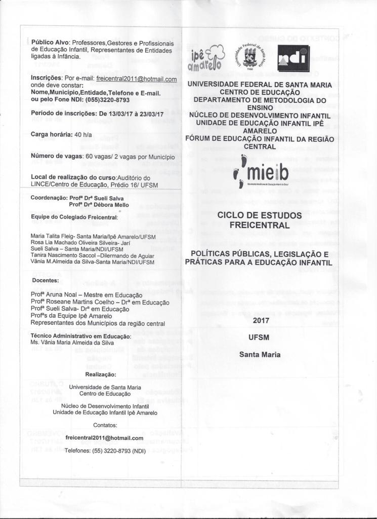 Informamos que já se encontram abertas as Inscrições para o FÓRUM DE EDUCAÇÃO INFANTIL DA REGIÃO CENTRAL DO ESTADO- FREICENTRAL 2017- no período de 13/3/17 à 30/3/2017 e podem ser feitas pelo e-mail: freicentral2011@hotmail.com