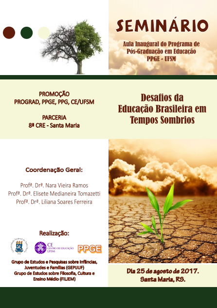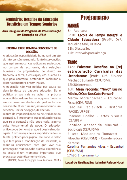Acontece nesta sexta-feira (25) o seminário “Desafios da Educação Brasileira em Tempos Sombrios”, aula Inaugural do Programa de Pós Graduação em Educação (PPGE) da UFSM. Durante a manhã, será debatida a questão da “Escola em Tempo Integral e Cidade Educadora”, com a Profª Drª Jaqueline Moll (UFRGS). No início da tarde, às 14h haverá a palestra “Desafios na [re]estruturação Curricular das Licenciaturas” com a Profª Drª do Centro de Educação Elisiane Lunardi. Posteriormente acontecerá a Mesa Redonda “Novo Ensino Médio, O que nos Cabe Pensar?” com a participação de profissionais das áreas de Educação Física, Artes Visuais, Sociologia, Filosofia e Espanhol, disciplinas que não são mais obrigatórias a partir do segundo ano do Ensino Médio. Durante o seminário também será lançado o livro das autoras Sueli Salva, Nara Ramos e Elisete Tomazetti.