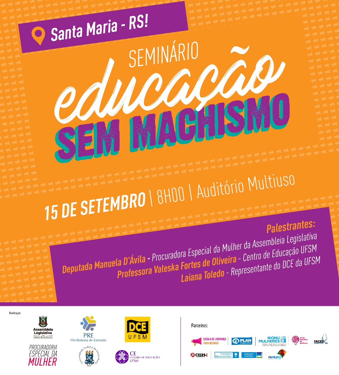 Será às 8h no auditório Multiuso da UFSM e contará com a presença das palestrantes: Procuradora Especial da Mulher da Assembleia Legislativa – Deputada Manuela D’Avila, Valeska Fortes de Oliveira – Professora do Centro de Educação e Laiana Toleto – representante do DCE.