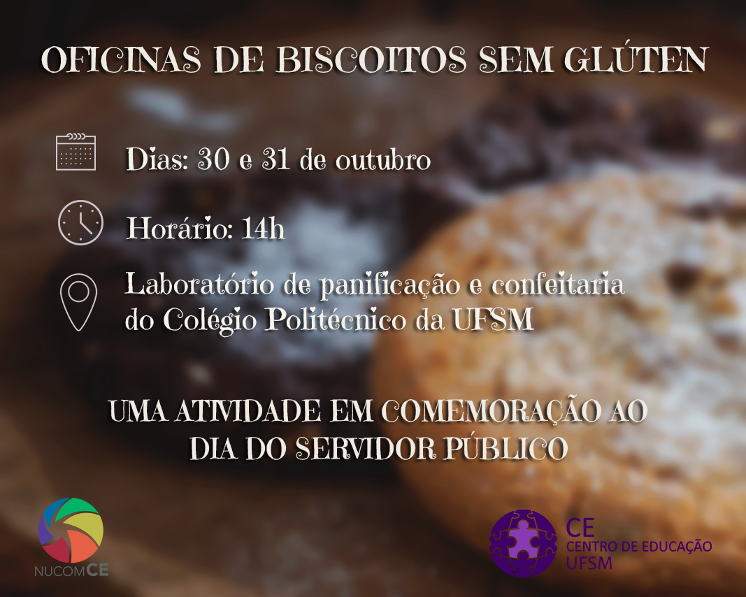 Nos dias 30 e 31 de outubro acontecerão no Laboratório de Panificação do Colégio Politécnico, duas oficinas de biscoitos sem glúten. Para comemorar o Dia do Servidor Público, será proporcionada aos servidores do Centro de Educação uma atividade que agregue ao prazer de aprender e à qualidade de vida de todos.