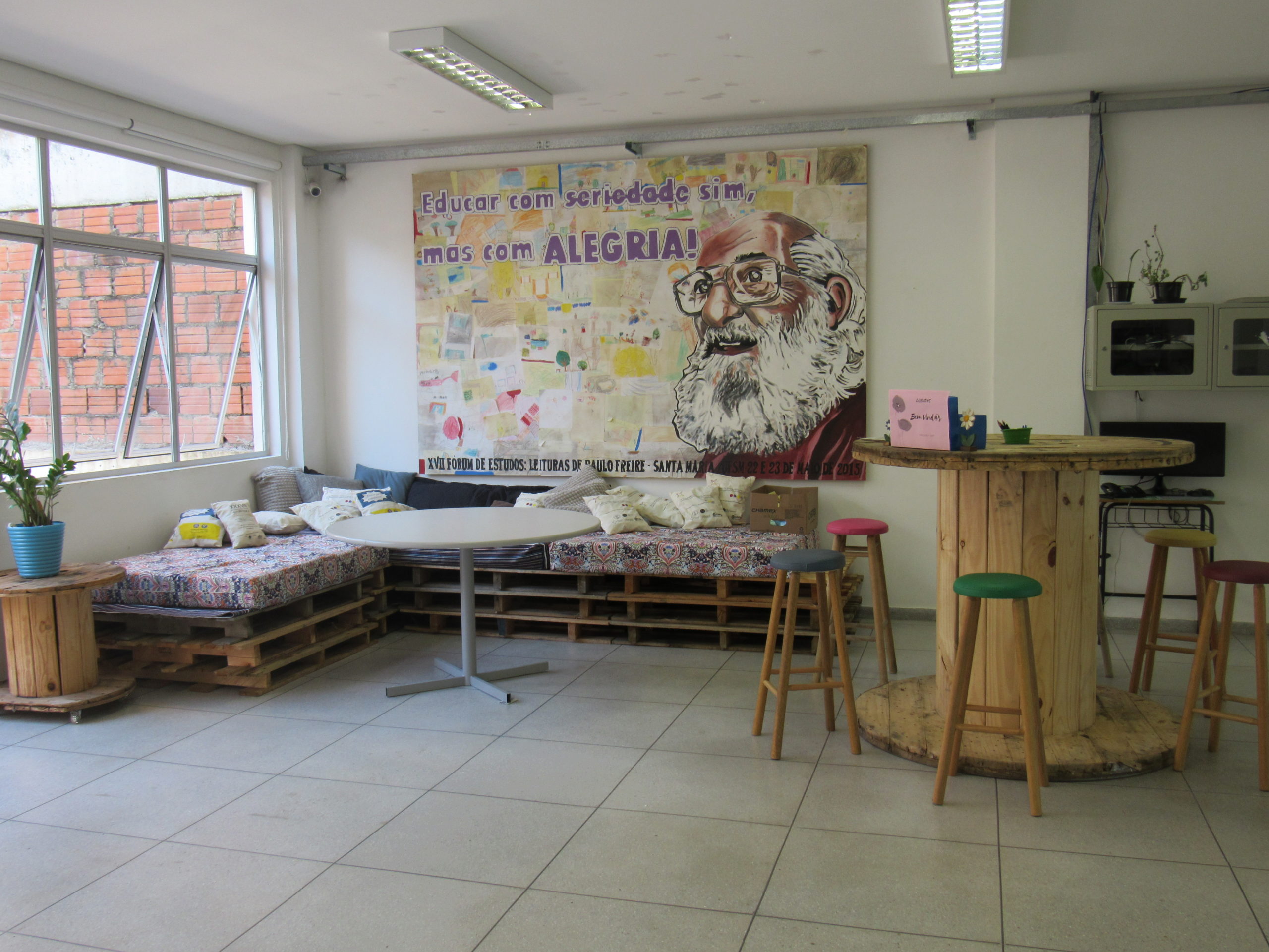 Como a formação profissional, que se constrói no plural, também é no coletivo que construímos o espaço de acolhida dos acadêmicos para o início do primeiro semestre de 2018. Constituído com algumas doações da comunidade externa e interna de nossa Instituição, nossa ideia é reutilizar materiais, aproveitar descartes para a organização de espaços como este no Centro de Educação.