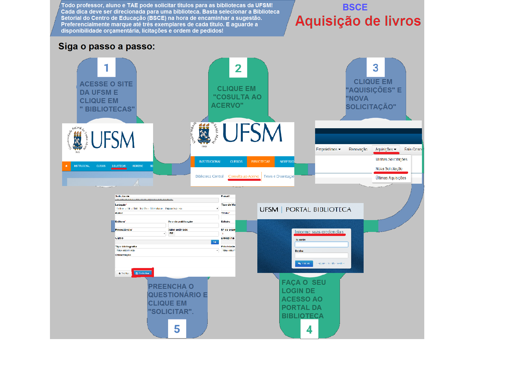 Todo professor, aluno e TAE pode solicitar títulos para as Bibliotecas da UFSM. Saiba como funciona o processo para a solicitação no passo a passo abaixo: