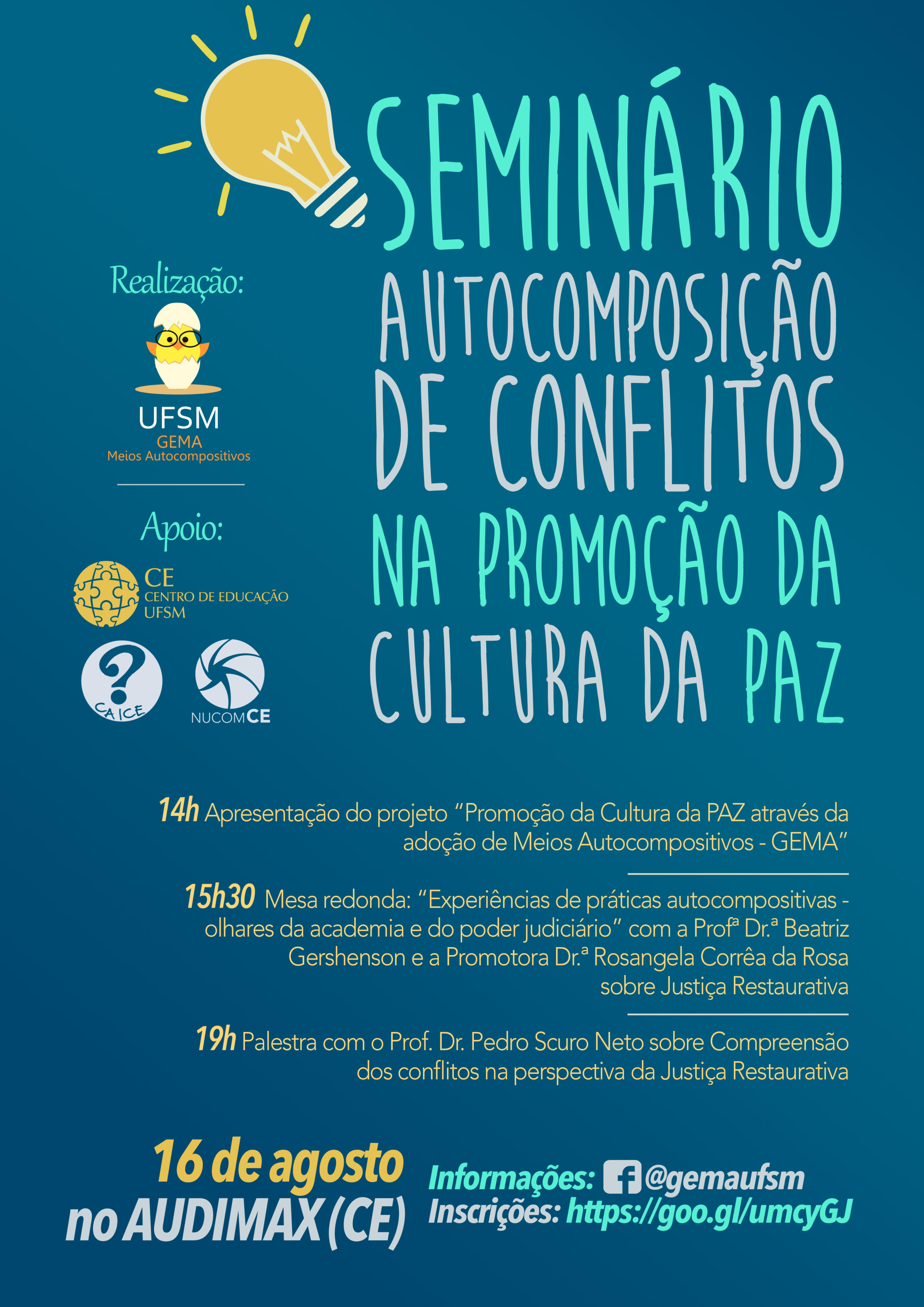 O Grupo de Estudos sobre Meios Autocompositivos (Gema/UFSM) promove no dia 16 de agosto o Seminário “Autocomposição de Conflitos na Promoção da Cultura da Paz”.