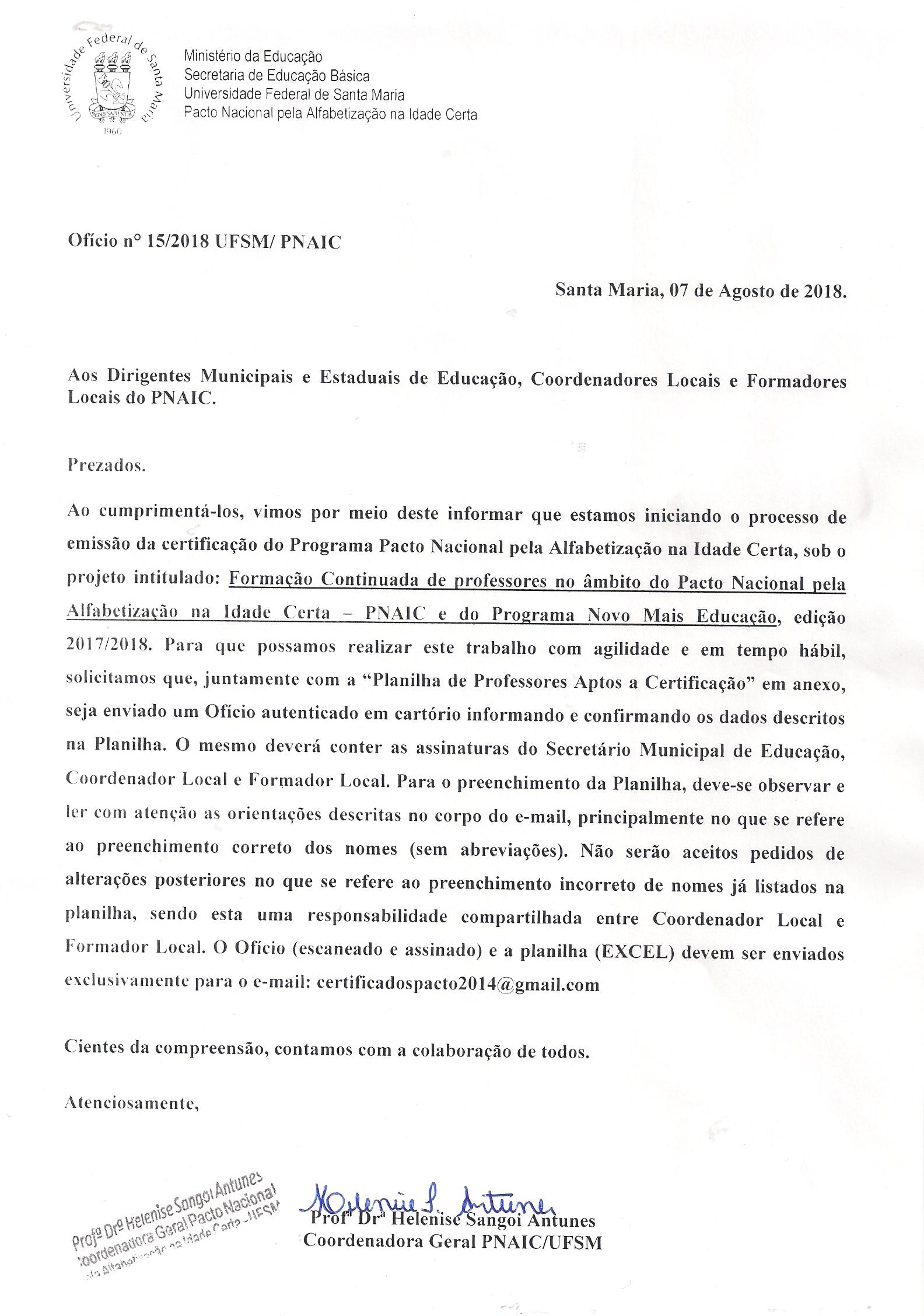 Encaminhamos as orientações para iniciar o processo de confecção e emissão dos certificados do PNAIC 2017/2018, por gentileza, leiam com atenção as orientações. Encaminhamos ainda em anexo um ofício com orientações sobre o oficio que deve ser assinado e autenticado em cartório informando e confirmando os dados enviados na planilha dos professores aptos para certificação.