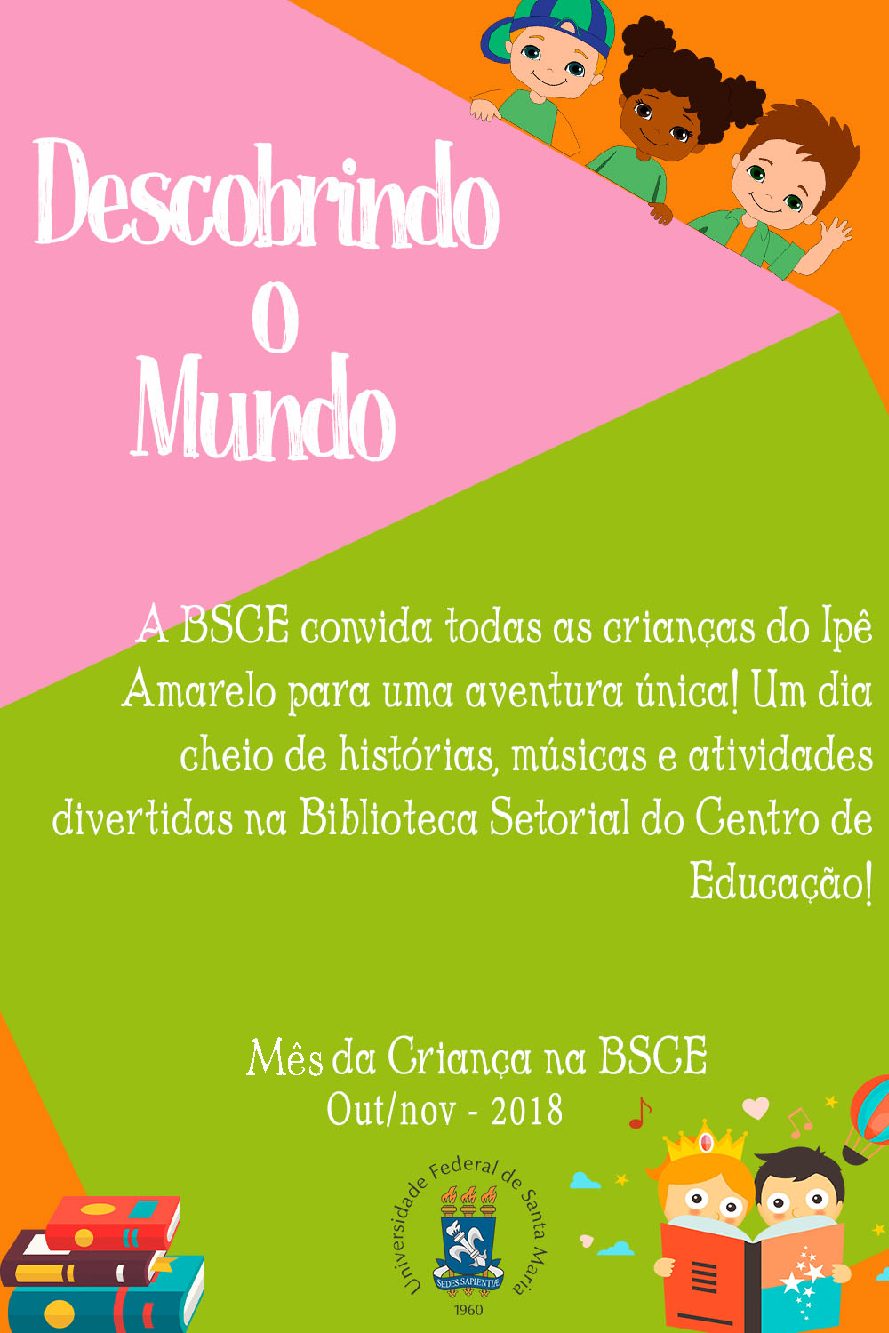 A Biblioteca Setorial do Centro de Educação convida as crianças do Ipê Amarelo para dia de atividades. Será um dia de histórias, músicas e brincadeiras em comemoração ao mês da criança.