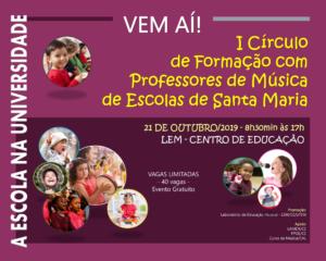 O Laboratório de Educação Musical do Centro de Educação promove o I Círculo de Formação com Professores de Escolas de Santa Maria, o evento ocorrerá no primeiro dia da JAI, 21/10.  Nesta 1ª. edição participarão os professores Jade Schneider (Colégio Fátima), Josemar Dias (Colégio Fátima), Matheus Lameira (Colégio Fátima), Jane Correa (Colégio Sant’Anna), e Douglas Duarte (Colégio Marco Polo).