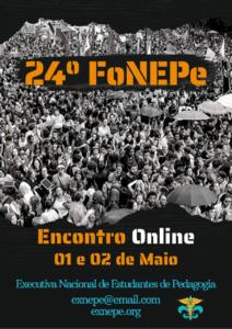 A Executiva Nacional de Estudantes de Pedagogia (ExNEPe) convida as entidades de pedagogia, os estudantes de pedagogia, licenciatura e pós-graduação, professores, educadores, pesquisadores em educação, ativistas e militantes em defesa do ensino público de todo o país para participarem do seu 24º Fórum Nacional de Entidades de Pedagogia (FoNEPe), que será realizado excepcionalmente de forma VIRTUAL – devido a quarentena em decorrência da pandemia do Covid-19 – nos dias 1 e 2 de maio.