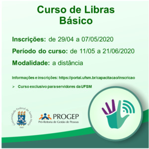 A Pró-Reitoria de Gestão de Pessoas informa que estão abertas as inscrições para o Curso de Libras Básico – EAD. A capacitação tem como objetivo possibilitar aos servidores da UFSM a aprendizagem e o contato com a Libras, oportunizando assim a acessibilidade e a inclusão das pessoas surdas nos diferentes contextos universitários.