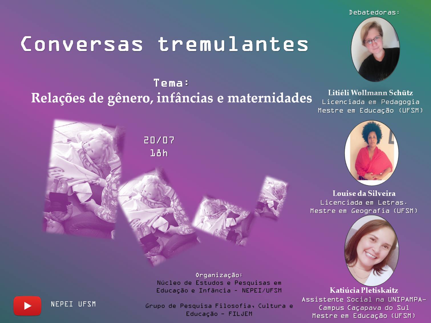O Grupo de Estudos “Filosofia, Cultura e Educação” (FILJEM/CNPq) e o “Núcleo de Estudos e Pesquisas em Educação e Infância” (NEPEI/UFSM) uniu esforços para organizar a série de encontros “Conversas Tremulantes” com o objetivo de colocar em cena temas de interesse público que tem em comum a discussão sobre educação, considerada como direito universal, culturas, infâncias, juventudes, direitos humanos, relações de gênero, sexualidades, relações etnicorraciais, interseccionalidades, educação infantil, ensino de Filosofia entre outros.