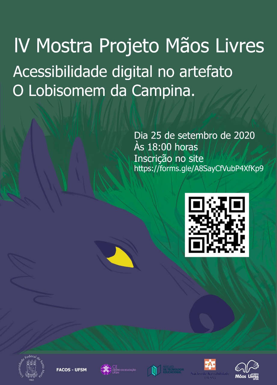 2020 as 18 horas. Inscrição no site: https://forms.gle/A8SayCfVubP4XfKp9 ou pelo QrCode. Abaixo e à direita, quadrado branco com pontilhados de QrCode. À esquerda, O Lobisomem, de perfil direito, orelhas pontudas, focinho longo, olhos amarelos e pelagem roxa. Ao fundo, campina verde com mato alto. Na parte inferior da imagem , assinatura e marcas dos apoiadores e colaboradores. São eles: o brasão da Universidade Federal de Santa Maria – UFSM, composto por escudo, flor-de-lis, archotes e lema. Circundando o brasão, no sentido horário, em letras garrafais pretas: “Universidade Federal de Santa Maria, 1960”; a assinatura da FACOS em letras brancas, caixa alta e fonte arial; a marca do Centro de Educação da UFSM, composta por uma esfera com peças de quebra-cabeça de dois tons de roxo e contorno de cor branca: A do meio é lilás e as demais peças de cor roxa. À direita, em letras roxas, lê-se: “CE – Centro de Educação UFSM”. Marca do Núcleo de Tecnologia Educacional da UFSM, composta por uma ilustração de dois livros azuis-marinhos, abertos e cujas contracapas formam um pequeno retângulo verde-água, contornado por uma moldura em azul claro. À direita, em azul – marinho e caixa alta: ‘NÚCLEO DE TECNOLOGIA EDUCACIONAL” e abaixo, em verde – água: “UFSM”.Marca composta por um quadrado laranja em que falta, ao centro, uma peça de quebra-cabeça, e onde há uma letra “A”, cujo traço horizontal abre-se para a esquerda, como uma porta. Abaixo, “Núcleo de Acessibilidade UFSM”. Marca composta por duas mãos abertas, lado a lado e com os dedos para baixo. Abaixo, em letras brancas lê-se: “Projeto MÃOS LIVRES UFSM”.