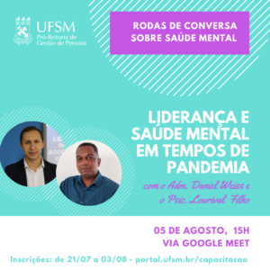 A Pró-Reitoria de Gestão de Pessoas (PROGEP) da Universidade Federal de Santa Maria (UFSM) informa que estão abertas as inscrições para a Roda de Conversa sobre Liderança e Saúde Mental em tempos de Pandemia, que ocorrerá no dia 05/08/2021, das 15h às 17h, via Google Meet.
