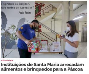 O jornal de Diário de Santa Maria repercutiu, neste dia 13, a Campanha de Arrecadação de Brinquedos e Alimentos para Páscoa, a fim de aumentar o engajamento da comunidade acadêmica da UFSM e santamariense na solidariedade.