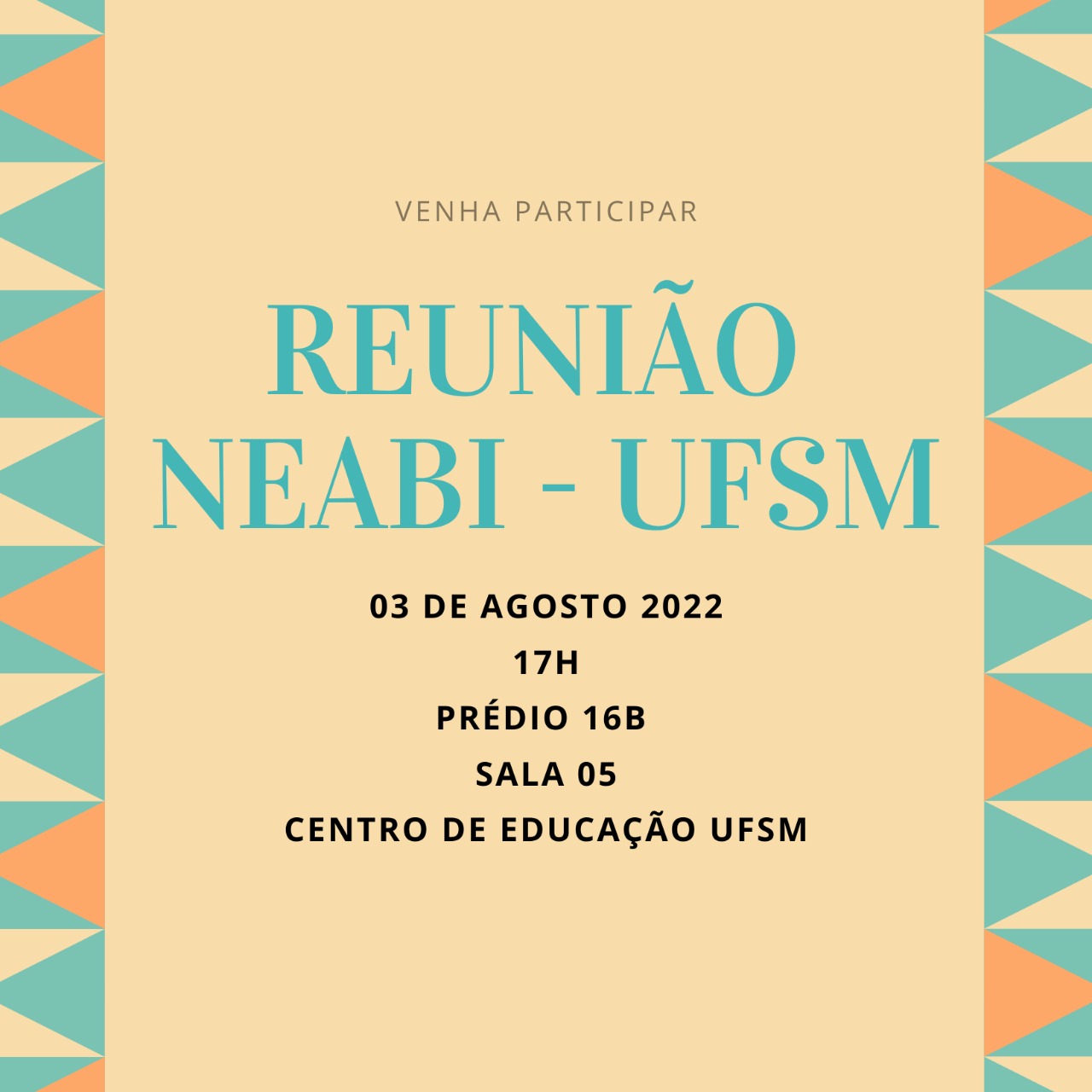 O NEABI/UFSM realiza reuniões quinzenais itinerantes em diferentes centros da Universidade. O próximo encontro ocorrerá no Centro de Educação e, além de avaliar as atividades desenvolvidos ao longo do semestre, definirá as proximas ações. Você é nosso/a convidado/a!