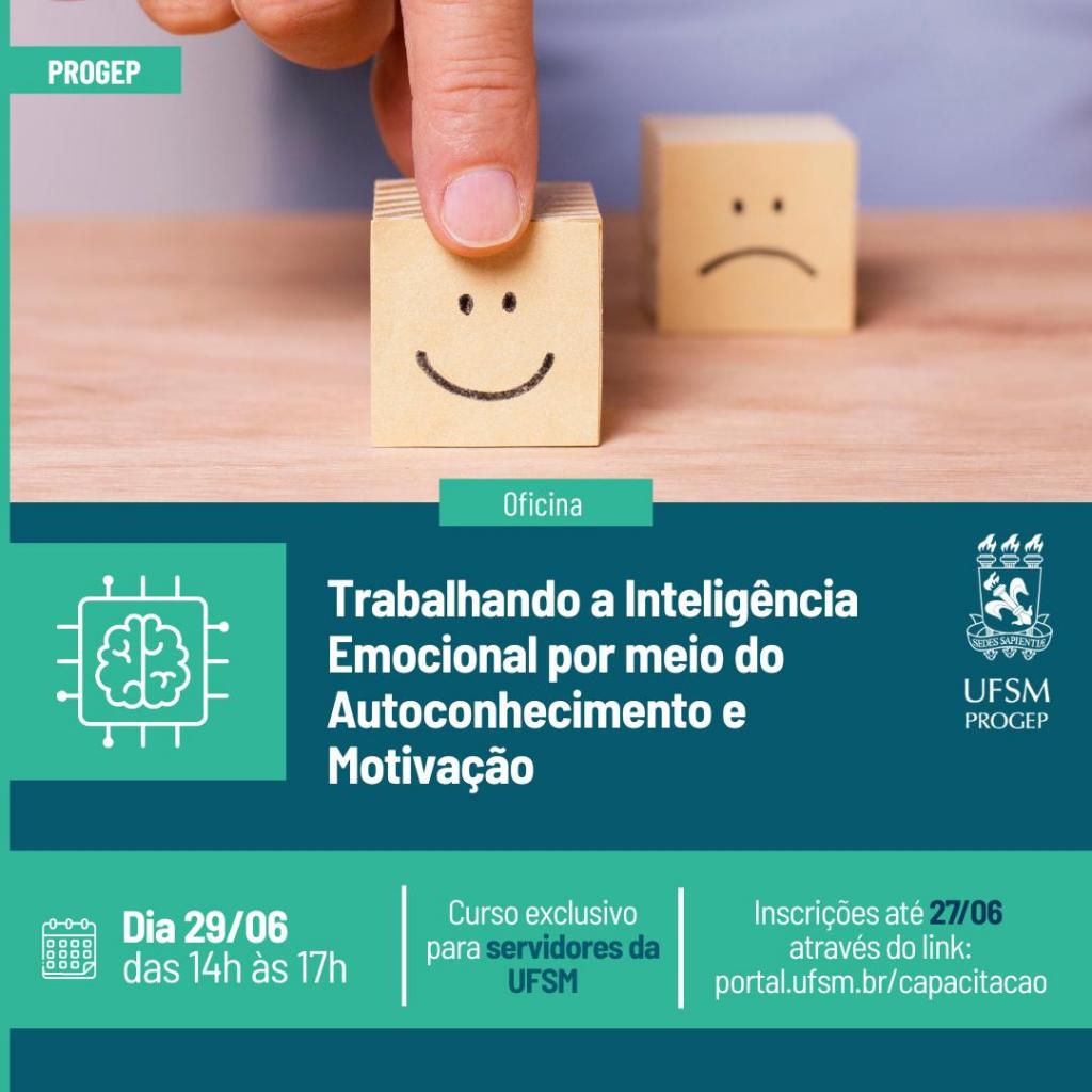 A Pró-Reitoria de Gestão de Pessoas da UFSM (Progep) informa que estão abertas as inscrições para a Oficina “Trabalhando a Inteligência Emocional por meio do Autoconhecimento e Motivação”. A ação tem como objetivo contribuir, por meio do autoconhecimento e da autoconsciência, para a melhoria do desenvolvimento humano dos servidores da UFSM.