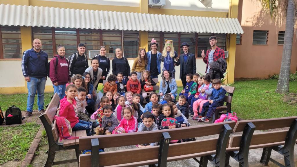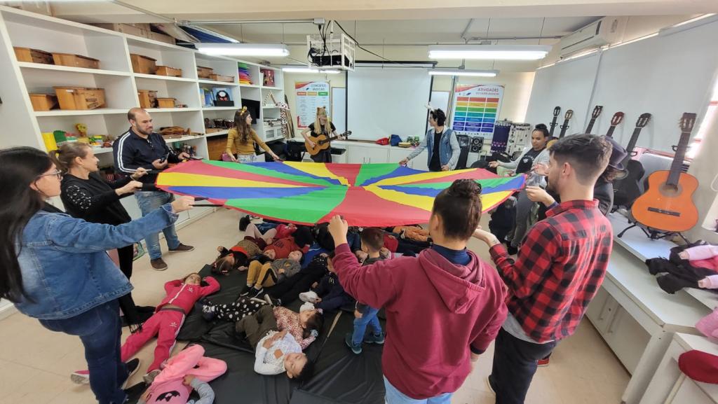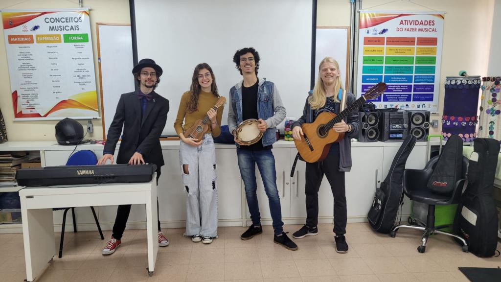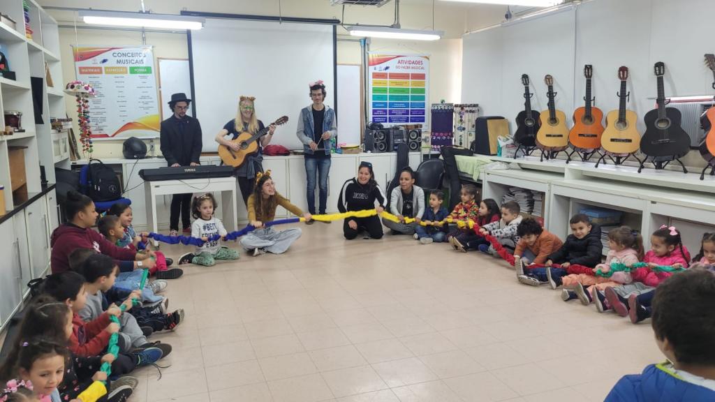 Já no último dia 07 de junho, o LEM recebeu a visita de crianças de 3 a 6 anos e professores da Escola Municipal Sérgio Lopes. As crianças e professores foram recepcionados pelos acadêmicos Bruna Schallenberger da Silva, Davi Janner Faller, Gustavo Henrique Soares da Silva e Mateus Henrique Granja Beledelli, que ministraram uma oficina de música para o grupo. A atividade fez parte das práticas extensionistas vinculadas à disciplina Didática Musical A, do curso de Música – Licenciatura, sob a responsabilidade da professora Luciane Wilke Freitas Garbosa, do CE.