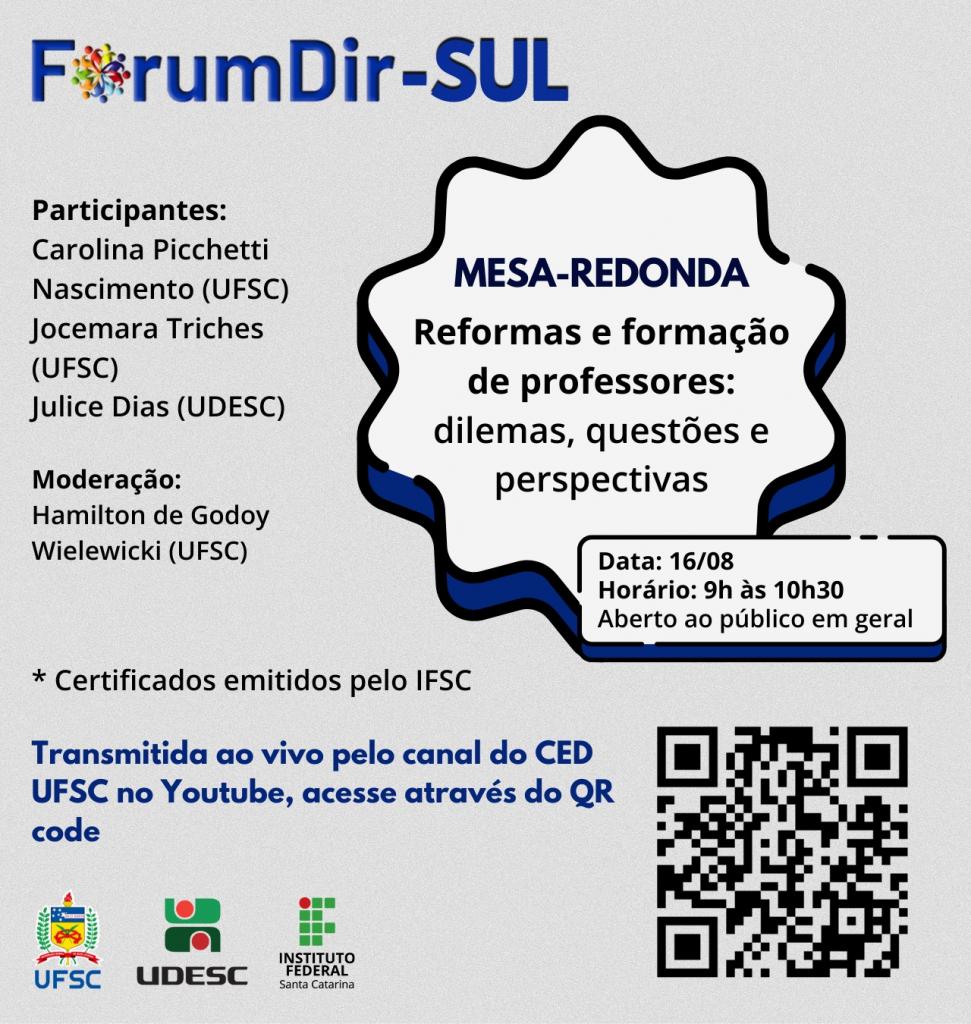 Neste dia 16 de agosto (quarta-feira), às 9h, ocorre no canal no Centro de Educação da Universidade Federal de Santa Catarina (CED-UFSC) a edição da Mesa-Redonda do Fórum de Diretores das Faculdades, Centros e Escolas Superiores de Educação da região Sul do Brasil (FórumDir-Sul).