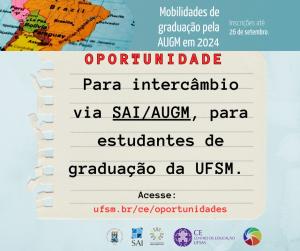 A Secretaria de Apoio Internacional comunica que estão abertas as inscrições para o edital de intercâmbio via AUGM (Associação das Universidades do Grupo Montevidéu), para estudantes de graduação da UFSM, com previsão de realização da mobilidade no primeiro semestre de 2024.