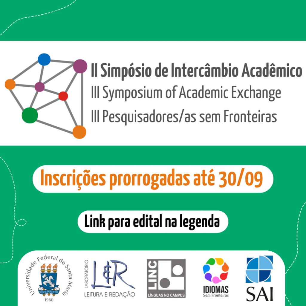 🌐 O III Symposium of Academic Exchange (SAE), um evento satélite da 38ª Jornada Acadêmica Integrada, é voltado a dois grupos: 1) o SAE higher education, a alunos de graduação e de pós-graduação da UFSM que desenvolvem competência em inglês como língua estrangeira/adicional; e 2) o SAE high school, a alunos de nível médio do Colégio Técnico Industrial – CTISM e do Colégio Politécnico da UFSM. Em apoio à Internacionalização, Desafio 1 do Plano de Desenvolvimento Institucional 2016-2026 desta universidade, o III SAE desafia os participantes a apresentarem sua pesquisa em língua inglesa, em até cinco minutos, de forma envolvente, para que seja compreendida por um público acadêmico não especialista.