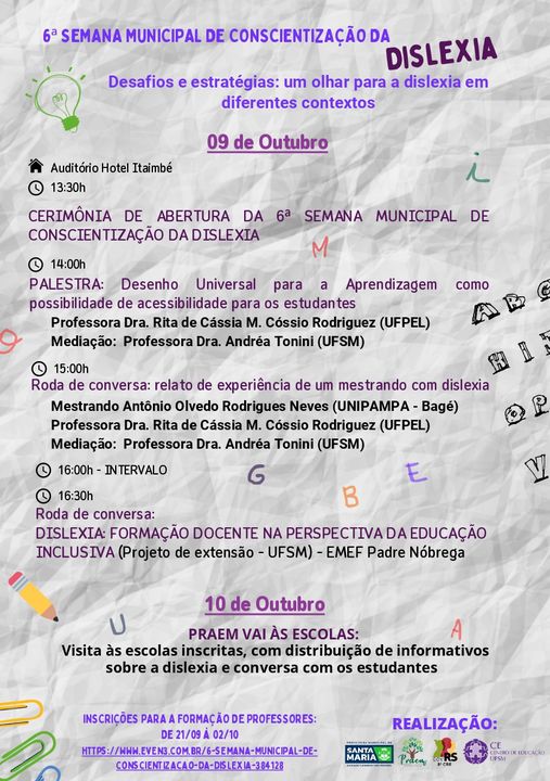 Fundo da imagem tem a textura de uma folha de papel com marcas de amassado; distribuídas entre as informações da programação aparecem letras manuscritas coloridas. Na parte superior da folha: 6ª SEMANA MUNICIPAL DE CONSCIENTIZAÇÃO DA DISLEXIA. A palavra ‘dislexia’ está em destaque. A esquerda uma lâmpada na cor verde. Ao centro o tema escrito em roxo: “Desafios e estratégias: um olhar para a dislexia em diferentes contextos”. Na sequência, nas cores roxo e preto, segue a programação do evento: no dia 09 de Outubro, abaixo da data aparece o símbolo gráfico de uma casa indicando o local do evento: Auditório Hotel Itaimbé, logo abaixo, , ao lado dos horários da programação do evento aparece o sinal gráfico de um relógio na cor preta. Às 13:30h Cerimônia de abertura da 6ª Semana Municipal de Conscientização da Dislexia, às 14:00h Palestra: Desenho Universal para Aprendizagem como possibilidade de acessibilidade para os estudantes com a professora Dra. Rita de Cássia M. Cóssio Rodriguez (UFPEL), e mediação da professora Dra. Andréa Tonini (UFSM), às 15:00h Roda de conversa: relato de experiência de um mestrando com dislexia, com Antônio Olvedo Rodrigues Neves (UNIPAMPA – Bagé), professora Dra. Rita de Cássia M. Cóssio Rodriguez (UFPEL) e mediação: Professora Dra. Andréa Tonini (UFSM), 16:00h – INTERVALO, 16:30h Roda de conversa: DISLEXIA: FORMAÇÃO DOCENTE NA PERSPECTIVA DA EDUCAÇÃO INCLUSIVA (Projeto de extensão – UFSM) – EMEF Padre Nóbrega. No dia 10 de Outubro: PRAEM VAI ÀS ESCOLAS: Visita às escolas inscritas, com distribuição de informativos sobre a dislexia e conversa com os estudantes. Na parte inferior da página, à esquerda, o desenho de um lápis de escrever e alguns clips nas cores amarelo verde e azul; no rodapé, a informação de que as inscrições são de 21/09 à 02/10 e o link das inscrições https://www.even3.com.br/6-semana-municipal-de-conscientizacao-da-dislexia-384128/ ; na parte inferior direita, as logos das instituições envolvidas na realização do evento: Prefeitura Municipal de Santa Maria, PRAEM, 8ª CRE e Centro de Educação/UFSM.