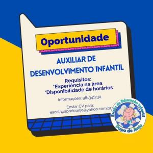 • Vaga para Auxiliar de Desenvolvimento Infantil, na Escola Papo de Anjo: clique aqui.