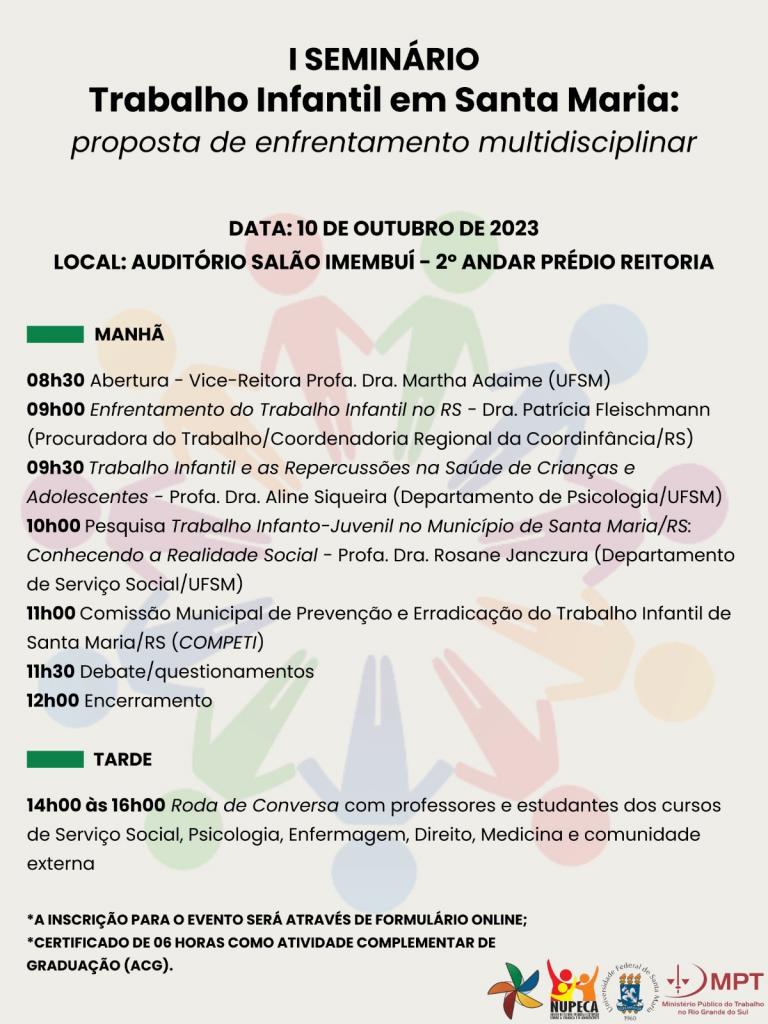 I Seminário Trabalho Infantil em Santa Maria: proposta de enfrentamento multidisciplinar, promovido pelo Ministério Público do Trabalho/RS em parceria com o Núcleo de Estudo, Pesquisa e Extensão Criança e Adolescente (NUPECA – Curso de Serviço Social da Universidade Federal de Santa Maria).