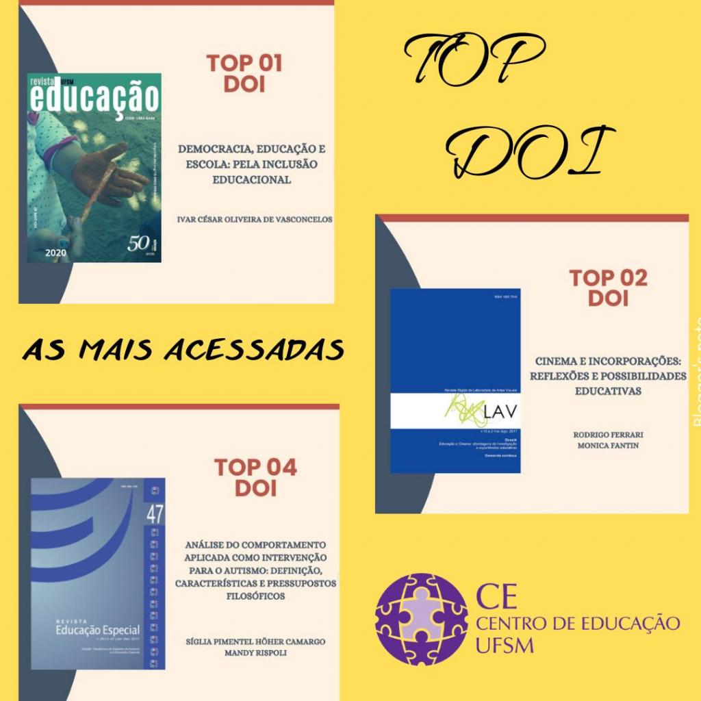 A Pró-Reitoria de Pós-Graduação e Pesquisa da UFSM (PRPGP) listou os artigos mais acessados pelo DOI (Identificador de Objeto Digital) do mês de setembro, na relação divulgada pela Pró-Reitorias de Pós- Graduação e Pesquisa da UFSM. Como o próprio nome diz, o DOI é um registro para qualquer tipo de arquivo digital. E as revistas do Centro de Educação (CE) constam na lista da PRPGP, com os seguintes artigos: